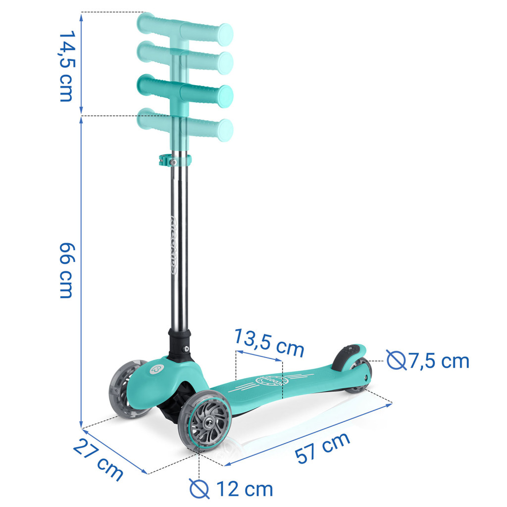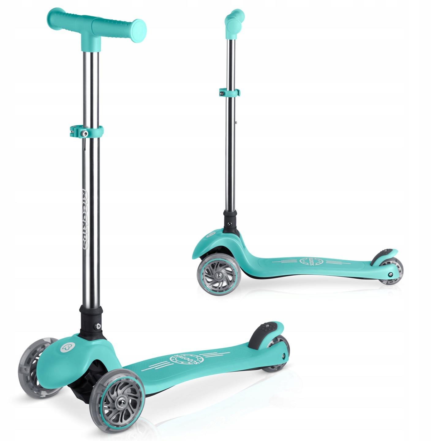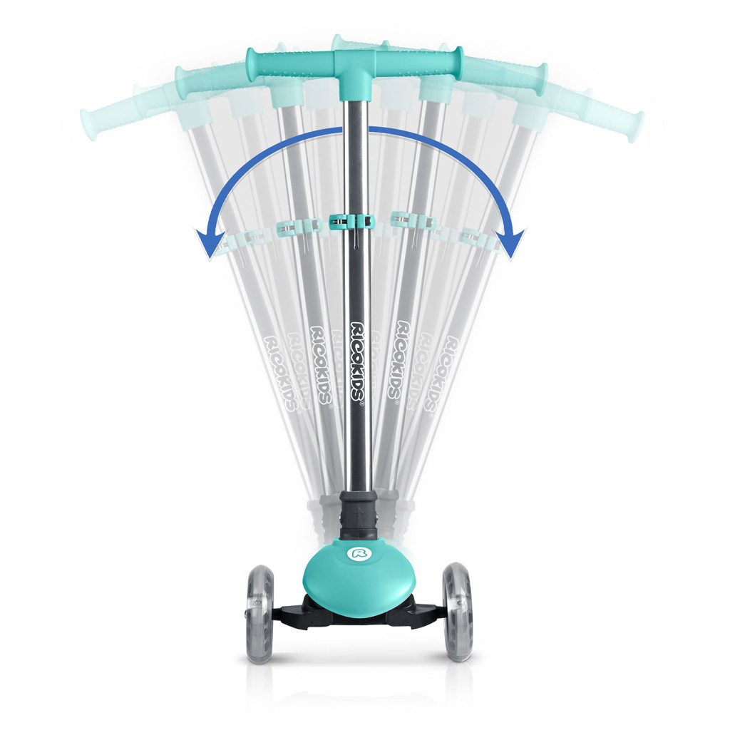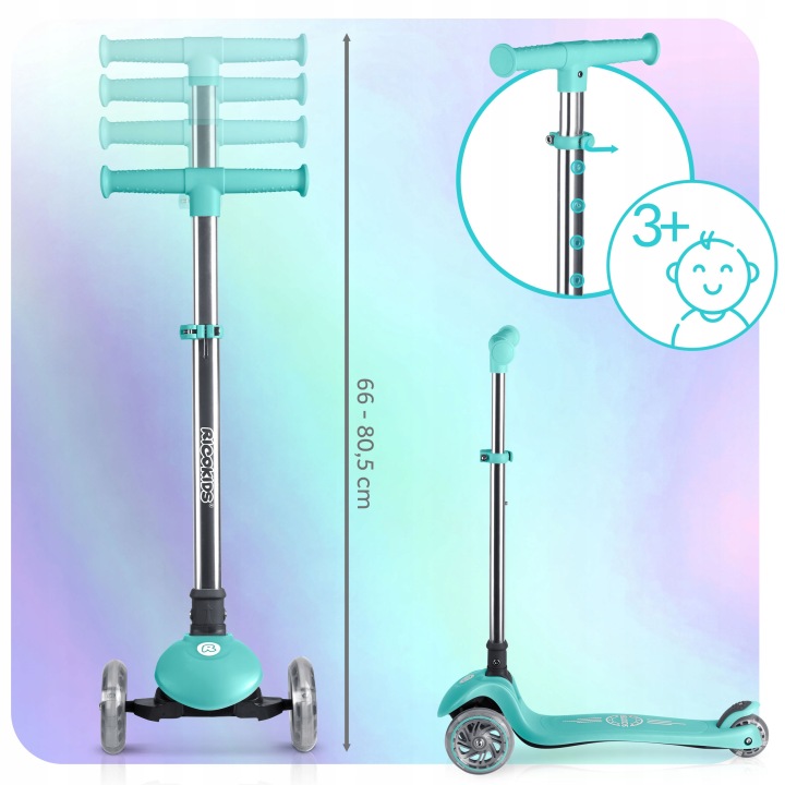 A világítós háromkerekű roller, türkiz | Ricokids Glow stabil utazást és szórakoztató világítást kínál, amely növeli a láthatóságot mozgás közben. A roller stabil és kényelmes utazást biztosít, míg a test döntésével történő irányítás támogatja az egyensúly és a koordináció természetes fejlődését.