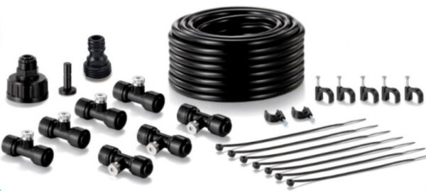 Egyszerűen csatlakoztatható egy hagyományos kerti tömlőhöz vagy csaphoz, és 2–5 bar nyomáson működik, így teraszokra, pergolákra, erkélyekre, strandokra, kempingekbe vagy éttermekbe is telepíthető, valamint virágágyások vagy üvegházak kíméletes öntözésére is használható. A csomag tartalmaz egy 7,5 méteres tömlőt, 5 mikro fúvókát, egy dugót, rögzítőpántokat, konzolokat és egy adaptert – az összeszerelés gyors és intuitív, szerszámok nélkül. Télen a fagykárok elkerülése érdekében célszerű szétszerelni a rendszert.
